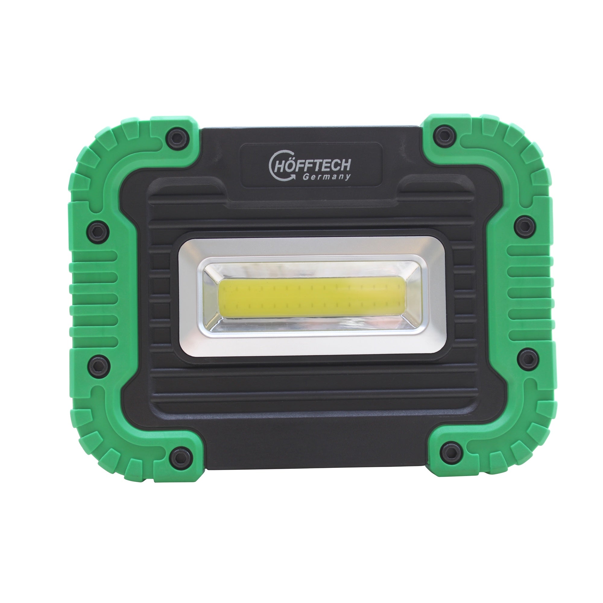 This battery-powered LED work light is equipped with a powerful 8-watt COB LED chip and is battery-powered. Its impressive output makes it a direct replacement for a 150-watt halogen work light. It's ideal for situations where a fixed power connection isn't available but additional light is needed, such as construction work or other outdoor activities. Runtime and Versatility: With new batteries, this LED work light offers a runtime of 2 hours, giving you plenty of time to complete your tasks. It's splashproof (IP44) and therefore suitable for both indoor and outdoor use, making it versatile for various environments. Features: