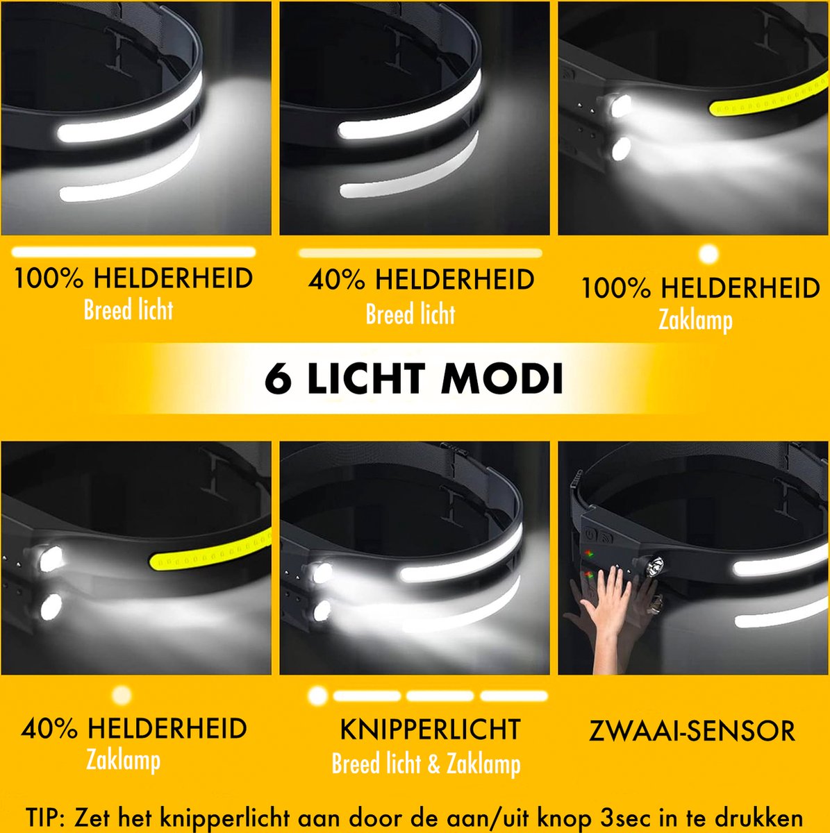 Rechargeable and Durable: This headlamp is powered by a powerful rechargeable battery (1200 mAh), which can be easily charged with the included USB-C cable. This makes the lamp not only durable, but also environmentally friendly and cost-efficient, as you no longer need to buy new batteries. Powerful Lighting with Various Modes: With its 350 lumens of light output and five different modes, this headlamp offers an impressive amount of light for any situation. Whether you need a wide beam for maximum visibility or a spotlight for focused illumination, this lamp has it all. Convenient Motion Sensor: In addition to the standard on/off button, this headlamp also features a convenient motion sensor. This allows you to easily switch the lamp on and off by waving your hand in front of it, which is especially useful in situations where your hands are dirty or when you are holding other objects. Multifunctional and Versatile: Whether you are running, camping, doing DIY projects, or walking the dog, this headlamp is suitable for all kinds of activities and conditions. With its water-resistant housing (IPX4) and adjustable headband, it offers comfort and reliability wherever you go. Specifications: