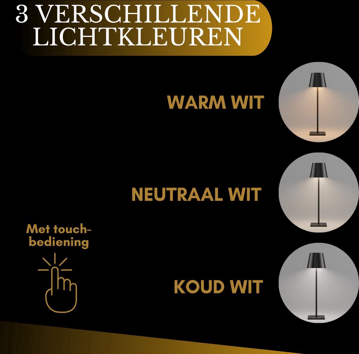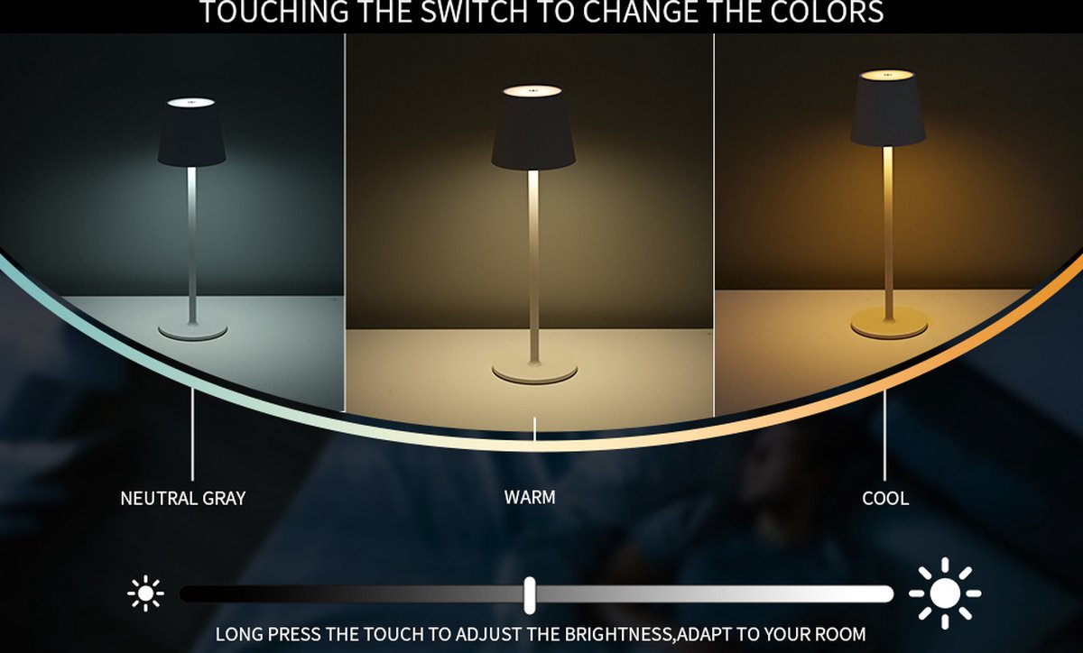 Discover the versatility of our lamp with the convenient touch switch. Adjust the lighting to your preference, whether you're looking for a soft glow for a romantic dinner or bright light for comfortable reading in bed. The lampshade adds a touch of subtle accent light from above and distributes the main light evenly downward. But that's not all - with this single bulb, you can choose between warm white, neutral white, and cool white light, allowing you to create the right ambiance for any occasion. Whether it's an intimate evening at home or creating a relaxing reading environment, this lamp offers the versatility and customization you need. Enjoy the perfect lighting for any situation with our touch switch and lampshade. Easy Control with a Touch The touch switch on top of the lampshade makes operation effortless. Tap to turn the light on or off, and hold your finger down to adjust the brightness. With a simple touch, you can adjust the lighting to your preference. Durability and Weather Resistance The weighted base and anti-slip profile ensure the table lamp stands securely on any surface. With a splash-proof rating (IP54), you can use it both indoors and outdoors. Feel free to place it in your living room for a touch of ambiance. Long Lighting Time The built-in 5200 mAh rechargeable battery guarantees long-lasting lighting. Depending on the light setting, the lamp lasts between 9 and 48 hours on a full charge. With the included USB-C cable, you can fully charge the lamp in just 5 hours. Benefits That Count
