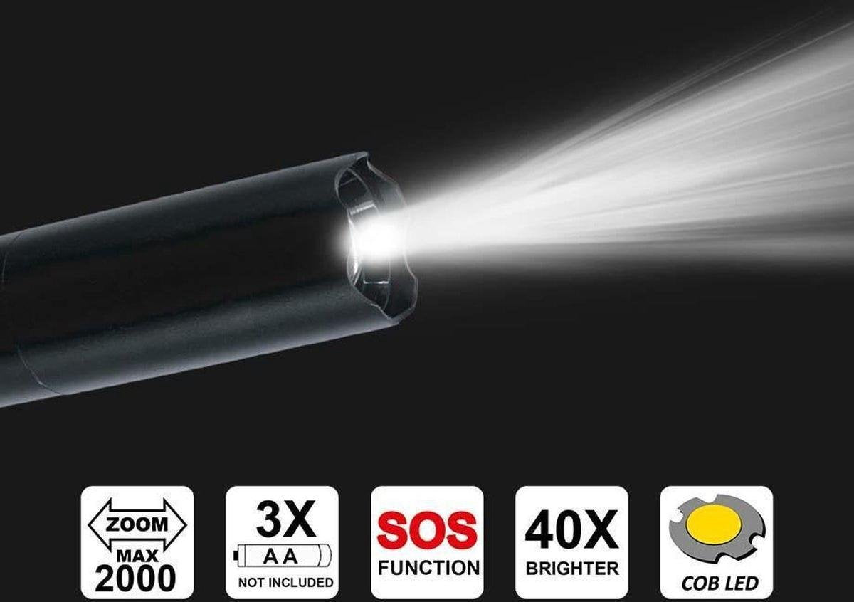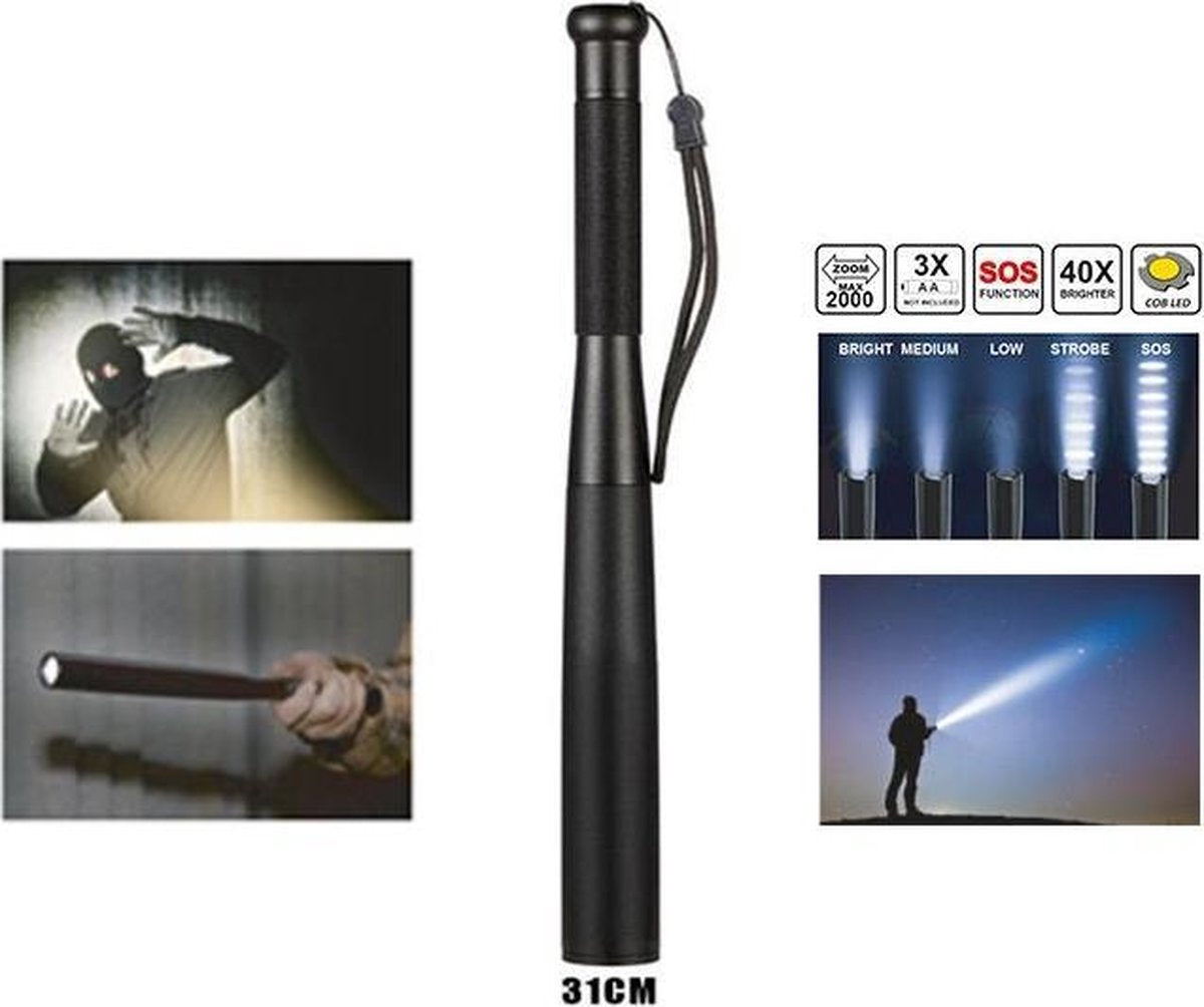 There are flashlights, and flashlights. This military-spec XXXL aluminum model is the ultimate powerhouse. No one will regret this purchase, as this baseball bat-shaped flashlight is even used by the US military. Even if you're not on a military mission and just want to stay safe in your own home, this flashlight is ideal. Safety First - Protection in the Dark. Burglaries and other forms of crime are a major concern. Fortunately, this seriously sized flashlight helps everyone sleep much better. Do you also want to be optimally prepared for danger? With this military-grade flashlight, you can disorient intruders while enjoying crystal-clear vision. Prepared for Anything - Durable and Powerful. This waterproof model is up to 40 times more powerful than a regular flashlight. Thanks to COB LED technology, even the most extreme situations pose no danger. Whether you just want to walk around the campsite, go on a scavenger hunt in the dark, or just put this flashlight in your meter box for safety, you're prepared for anything. Benefits: