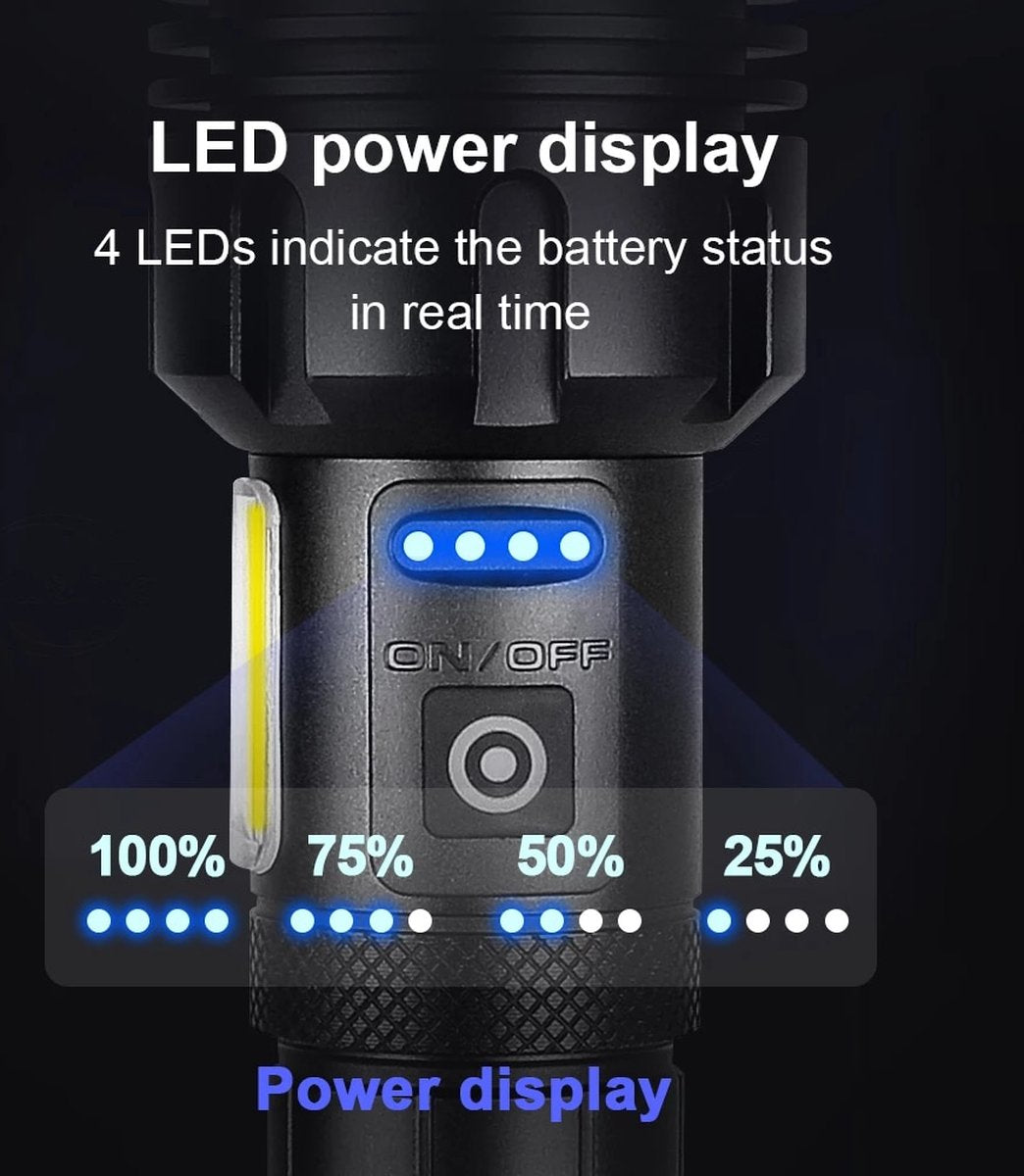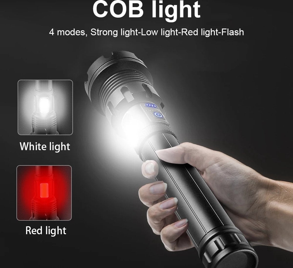 Enormous light output : 3000 lumens provide clear visibility up to 1000 meters. This means you'll always have sufficient light during your nighttime activities and never be left in the dark again. This rechargeable flashlight also features five settings, allowing you to easily choose the desired brightness and mode to suit the situation. USB rechargeable : No batteries that die when you least expect it, but a rechargeable battery that lasts up to 8 hours. That's the reliability and security the TomorrowNow flashlight offers. Can be used as a power bank: Are you in the middle of nature and far from home? Then you'll want to have a charged phone with you in addition to a sturdy flashlight. That's why this LED flashlight can also be used as a power bank. This way, you're always reachable and never alone. Sturdy and waterproof : When you use this rechargeable LED flashlight outdoors, you want to be sure it's durable, can withstand a knock, and can be used in the rain. That is why this flashlight is equipped with waterproof material, so rain and mud are no problem.