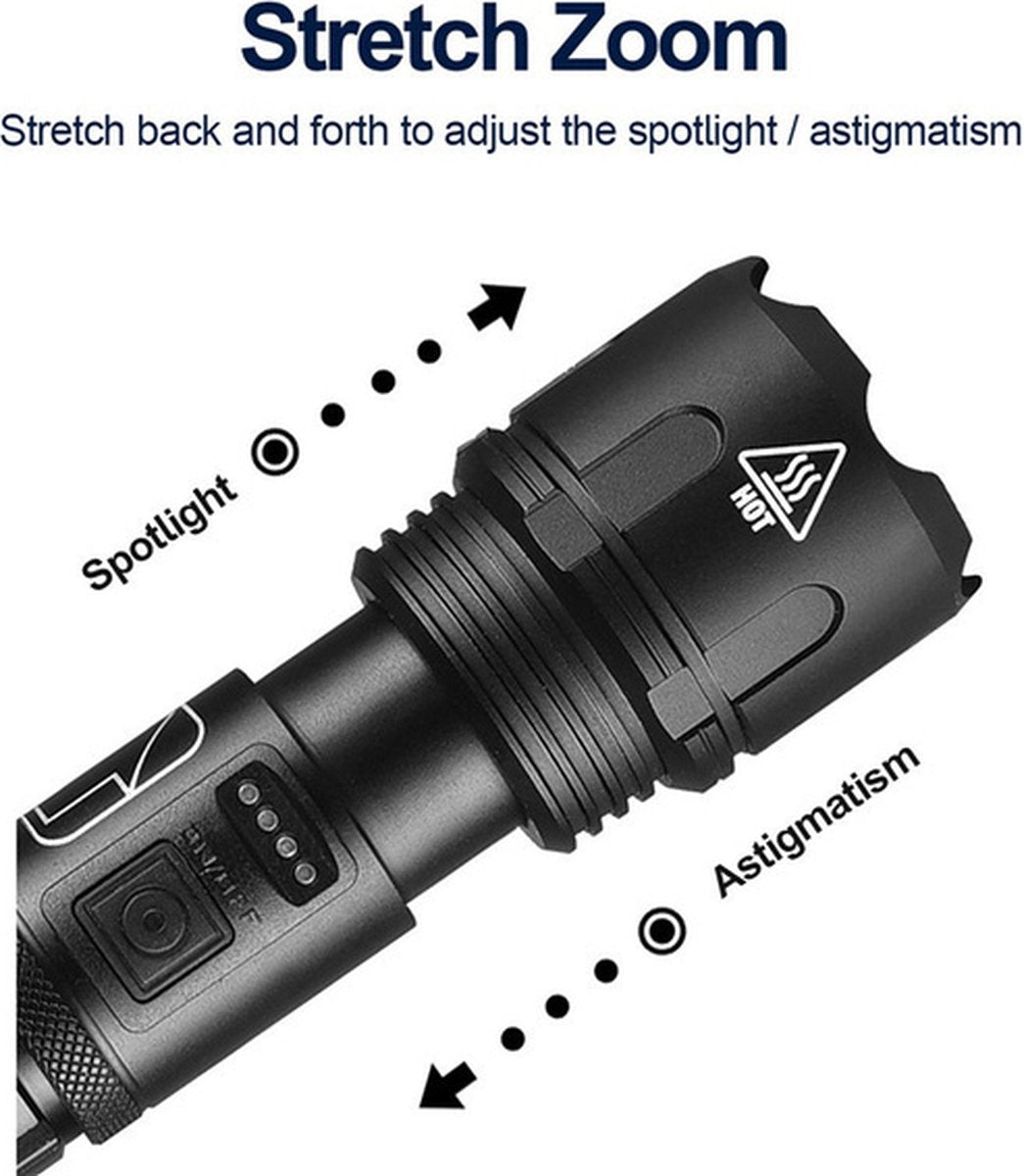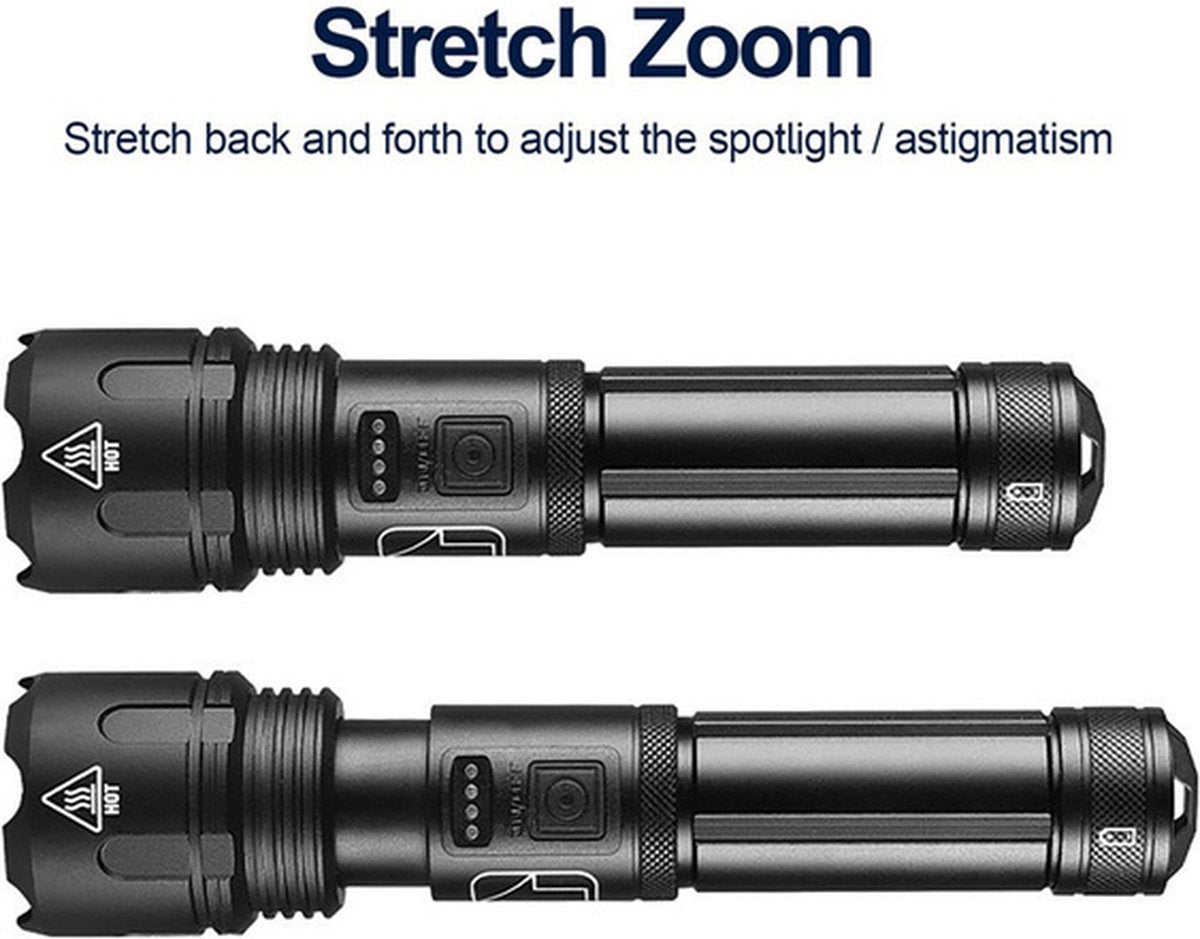 Are you looking for a flashlight of the highest quality and the highest light output in its class? You've found it! The TAC-5 XHP50 rechargeable LED flashlight has the highest light output available in this segment. With 3,000 lumens, this flashlight can shine up to 1,000 meters. That's a distance of about 9 football fields. With this flashlight, you will enjoy years of enjoyment! This flashlight is manufactured to the highest standards and is made of extremely strong and lightweight aircraft-grade aluminum. The flashlight has a Type-C and a Type-A connector, allowing you to charge it with the included cable. This allows for up to 10 hours of burn time. These connectors can also be used to use the flashlight as a power bank. Extremely useful if you want to charge your phone outdoors, for example. The zoom function allows you to shine a very focused beam of light on even the most distant objects. Want to use the flashlight indoors or for reading a book? You can use the button to set two lower brightness levels. Strobe and SOS functions are available for emergencies.