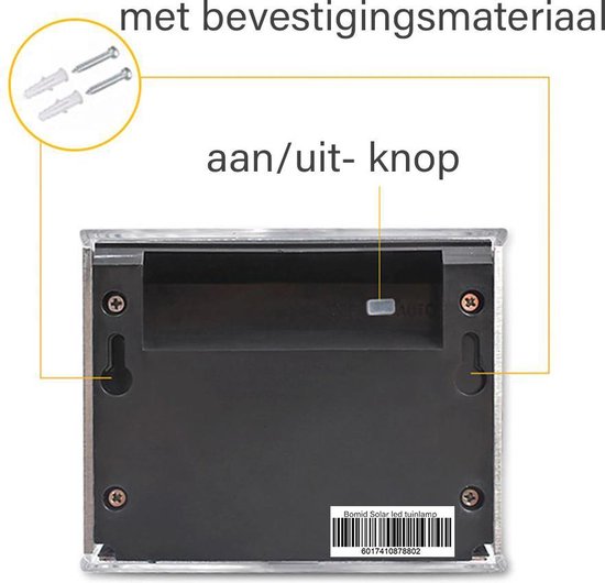 Heb jij weinig of slecht zicht rondom je huis wanneer het donker is? Installeer eenvoudig de Ezmarkt buitenlamp 6-pack! De buitenlamp werkt op zonne-energie en heeft geen stroompunt nodig dankzij de ingebouwde accu. Middels de dag/nacht sensor gaat de lamp automatisch aan en uit als het begint te schemeren. Verlicht je tuin en schrik ongewenste bezoekers af en ga met een gerust hart naar bed! Zonne-energie Een buitenlamp op zonne-energie is erg praktisch. Je zit niet vast aan stroompunten. Hang de lamp op met vier schroeven en je bent klaar! In de lamp zit een 1800 mAh accu die 12 uur per laadbeurt meegaat. Daarnaast wordt de opgebouwde zonne-energie efficiënt gebruikt dankzij de led verlichting. Alle weersomstandigheden De buitenlamp is ideaal voor bijvoorbeeld bij de achterdeur, rondom het huis of de oprit. Met een waterproof rating van IP65, geniet je van een lamp die zelfs hevige onweersbuien doorstaat. Tevens is de lamp stofdicht en geschikt voor plekken met opgewaaide stofdeeltjes. Verlicht de hele oprit Met de solar lamp van Ezmarkt geniet je van meer licht en een groter lichtbereik. De LED lampen met 300 Lumen geven bovengemiddeld veel licht af. Met onze 6-pack verlicht je het gehele gewenste oppervlak met één druk op de knop! Ezmarkt LED Solar Lamp ✔ Van hoogwaardig RVS ✔ Verlichtingshoek van 120° ✔ 6 LED lampen ✔ Dag/nacht Sensor ✔ Waterproof (IP65) ✔ Handige 6-pack Automatisch aan/uit Wanneer je de lampen inclusief dag/nacht installeert, hoef je je nooit meer druk te maken om het aan of uit zetten. Hoe vaak moet jij niet nog even je bed uit om die laatste vergeten lamp uit te doen? Met een dag/nacht sensor gaat dit allemaal vanzelf! Makkelijke installatie Met behulp van de meegeleverde twee pluggen en twee schroeven, installeer je deze lampen in no-time. De ideale ophanghoogte is tussen de 1.7 en 2 meter. Een kind kan de was doen! Specificaties: ▶ Inhoud Verpakking: 6 x LED solar lamp, 6 x gebruiksaanwijzing, 12 x schroeven, 12 x pluggen ▶ Materiaal: RVS, PC, RVS-schroeven ▶ Kleur: RVS ▶ Gewicht: 180,3 gram ▶ Afmetingen: 10 x 5 x 8 cm ▶ Certificaten: CE + RoHS ▶ Output: 5,5V 2 Watt ▶ Lumen: 300 ▶ Aantal LED lampen: 6 ▶ Batterij: 300mAh ▶ Bereik: 120° graden ▶ Lichtoppervlakte bedekking: 6,54 m2 ▶ Aantal lichtvlakken: 1 ▶ Waterdicht: Ja ▶ Draadloos: Ja ▶ Afstandsbediening: Nee