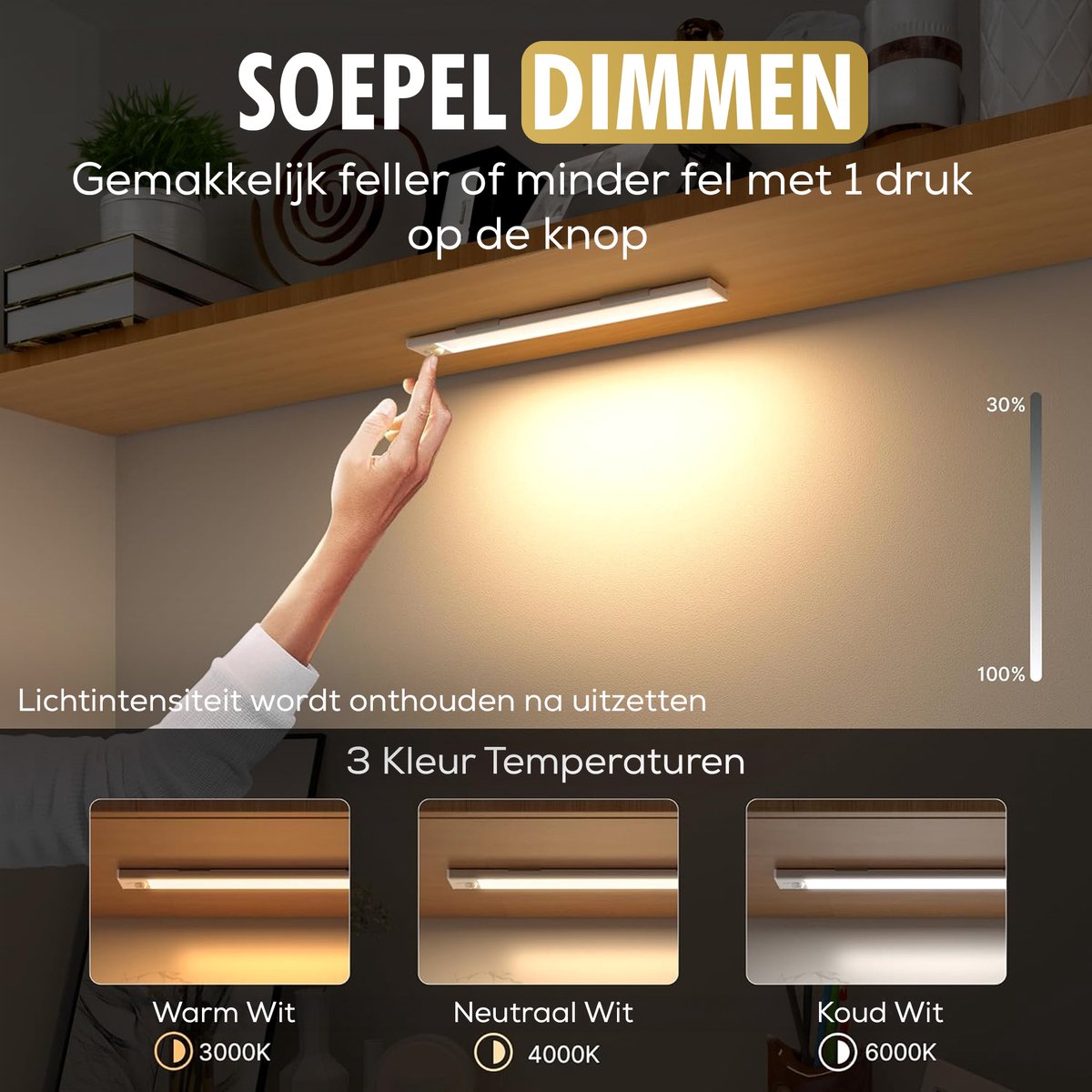 Veelzijdige Verlichtingsopties Dankzij de 78 LED-lampjes kun je kiezen uit 3 verschillende kleurtemperaturen (koud 6000K, neutraal 4000K, warm 3000K) voor je kastverlichting. Voor de perfecte sfeer kun je de lichtintensiteit traploos dimmen tussen 10% en 100%. De geheugenfunctie onthoudt de laatst gekozen instelling. Innovatieve Bewegingssensor Dankzij de PIR-bewegingssensor activeert de onderbouwverlichting gedurende 25 seconden zodra beweging wordt gedetecteerd; ideaal voor kasten, kledingkasten en gangen. Wil je de PIR-sensor niet wilt gebruiken? Geen probleem. Met de schakelaar kun je gemakkelijk kiezen tussen AAN-UIT-AUTO. Lange Levensduur en Oplaadgemak De USB-C oplaadbare kastverlichting heeft een oplaadtijd van 6 uur. Bij een volle batterij kun je in de AAN-modus tot 10 uur van je licht genieten, of kan de lamp tot 1500 keer geactiveerd worden met de PIR-sensor. De 3-laags lichtdiffuser zorgt voor een zachte, aangename lichtopbrengst van 150 Lumen. Deze verlichting is niet bedoeld om de netstroomverlichting te vervangen maar aanbevolen voor korte verlichtingsduur zoals in een kast, kelder of gang. Eenvoudige Installatie Profiteer van 2 magnetische zones en meegeleverde metalen platen en tape; bevestig je kastverlichting overal, van uw keukenkastjes, boekenkasten, gangen, veranda's tot slaapkamerkasten. Hoogwaardige Lichtdiffusie De verlichting beschikt over een 3-laags lichtdiffuser voor een zachte en aangename lichtopbrengst van 150 Lumen, wat zorgt voor een gelijkmatige verdeling van licht.