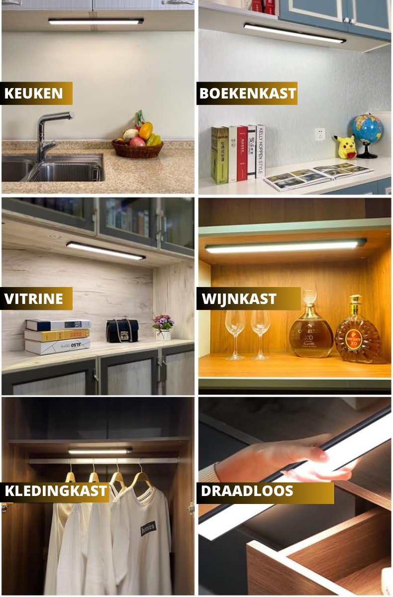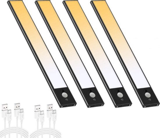 Hoogwaardige kwaliteit onderbouwverlichting (Nu in een 4-stuks voordeelpack), speciaal ontworpen voor gebruik in keukens, kasten en vitrines maar ook zeer handig als nachtlampje. In deze luxe onderbouwverlichting zijn 60 led lampjes verwerkt die optimaal licht geven. Deze veelzijdige verlichtingsoplossing van 40 centimeter lang dient ook als betrouwbare trap- en gangverlichting, waardoor het veiliger en sfeervoller wordt. Instelbare Helderheid en Design Met een indrukwekkende helderheid van 250 lumen biedt deze onderbouwverlichting voldoende licht om donkere ruimtes te verlichten. Bovendien is de helderheid volledig aanpasbaar, variërend van een zachte gloed tot helder daglicht, dankzij de dimbaarheid van 0% tot 100%. De onderbouwverlichting is vervaardigd uit hoogwaardig aluminium. Met een slank profiel van slechts 0,8 cm dik voegt het zich naadloos in uw interieur. Verlichting op Maat Kies uit drie verschillende lichtkleuren om de juiste sfeer te creëren voor elke gelegenheid. Met 2700K, 4000K en 6000K kunt u moeiteloos schakelen tussen warme, neutrale en koele verlichting door eenvoudigweg de aan/uit knop ingedrukt te houden. Drie Handige Modi Deze onderbouwverlichting heeft drie handige modi. In de eerste modus brandt de lamp constant, met een gebruiksduur van 6 uur. De tweede modus activeert de bewegingssensor, die bij detectie van beweging binnen 120 graden en 5 meter inschakelt en na 20 seconden zonder beweging weer uitschakelt met een gebruiksduur bij sporadisch gebruik van 30 dagen. De derde modus biedt een snelle uitschakeling. Oplaadbaar en Krachtig U hoeft zich geen zorgen te maken over batterijen, want onze lamp is uitgerust met een krachtige 1500 mAh accu. Met een constante brandtijd van 6 uur en een indrukwekkende standby-tijd van 30 dagen bij sporadisch gebruik, is de verlichting altijd klaar wanneer u deze nodig hebt. Eenvoudige Installatie Montage is een fluitje van een cent. Begin met het verwijderen van de stickers van de clips en bevestig deze stevig op een gladde ondergrond. Vervolgens kunt u de onderbouwverlichting moeiteloos op de clips plaatsen, dankzij het magnetische ontwerp. Geen gedoe met draden of gereedschap! Nederlandse Handleiding Inbegrepen Voor uw gemak wordt een gedetailleerde Nederlandse handleiding meegeleverd, zodat u de verlichting moeiteloos kunt installeren en aanpassen aan uw wensen. Specificaties: