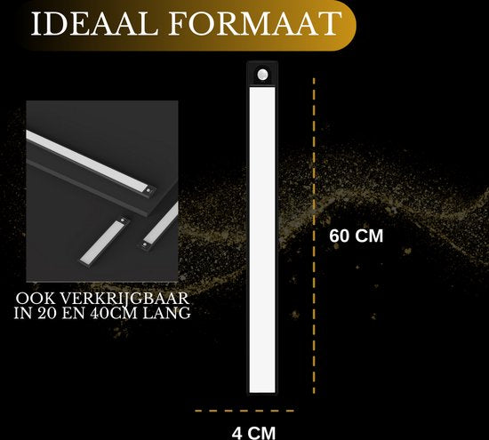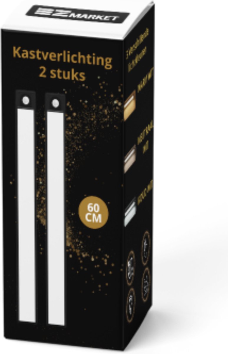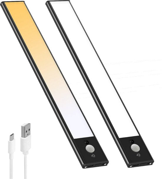Hoogwaardige kwaliteit onderbouwverlichting (Nu in een 2-stuks voordeelpack), speciaal ontworpen voor gebruik in keukens, kasten en vitrines maar ook zeer handig als nachtlampje. In deze luxe onderbouwverlichting zijn 60 led lampjes verwerkt die optimaal licht geven. Deze veelzijdige verlichtingsoplossing van 60 centimeter lang dient ook als betrouwbare trap- en gangverlichting, waardoor het veiliger en sfeervoller wordt. Instelbare Helderheid en Design Met een indrukwekkende helderheid van 350 lumen biedt deze onderbouwverlichting voldoende licht om donkere ruimtes te verlichten. Bovendien is de helderheid volledig aanpasbaar, variërend van een zachte gloed tot helder daglicht, dankzij de dimbaarheid van 0% tot 100%. De onderbouwverlichting is vervaardigd uit hoogwaardig aluminium. Met een slank profiel van slechts 0,8 cm dik voegt het zich naadloos in uw interieur. Verlichting op Maat Kies uit drie verschillende lichtkleuren om de juiste sfeer te creëren voor elke gelegenheid. Met 2700K, 4000K en 6000K kunt u moeiteloos schakelen tussen warme, neutrale en koele verlichting door eenvoudigweg de aan/uit knop ingedrukt te houden. Drie Handige Modi Deze onderbouwverlichting heeft drie handige modi. In de eerste modus brandt de lamp constant, met een gebruiksduur van 6 uur. De tweede modus activeert de bewegingssensor, die bij detectie van beweging binnen 120 graden en 5 meter inschakelt en na 20 seconden zonder beweging weer uitschakelt met een gebruiksduur bij sporadisch gebruik van 30 dagen. De derde modus biedt een snelle uitschakeling. Oplaadbaar en Krachtig U hoeft zich geen zorgen te maken over batterijen, want onze lamp is uitgerust met een krachtige 1500 mAh accu. Met een constante brandtijd van 6 uur en een indrukwekkende standby-tijd van 30 dagen bij sporadisch gebruik, is de verlichting altijd klaar wanneer u deze nodig hebt. Eenvoudige Installatie Montage is een fluitje van een cent. Begin met het verwijderen van de stickers van de clips en bevestig deze stevig op een gladde ondergrond. Vervolgens kunt u de onderbouwverlichting moeiteloos op de clips plaatsen, dankzij het magnetische ontwerp. Geen gedoe met draden of gereedschap! Nederlandse Handleiding Inbegrepen Voor uw gemak wordt een gedetailleerde Nederlandse handleiding meegeleverd, zodat u de verlichting moeiteloos kunt installeren en aanpassen aan uw wensen. Specificaties: