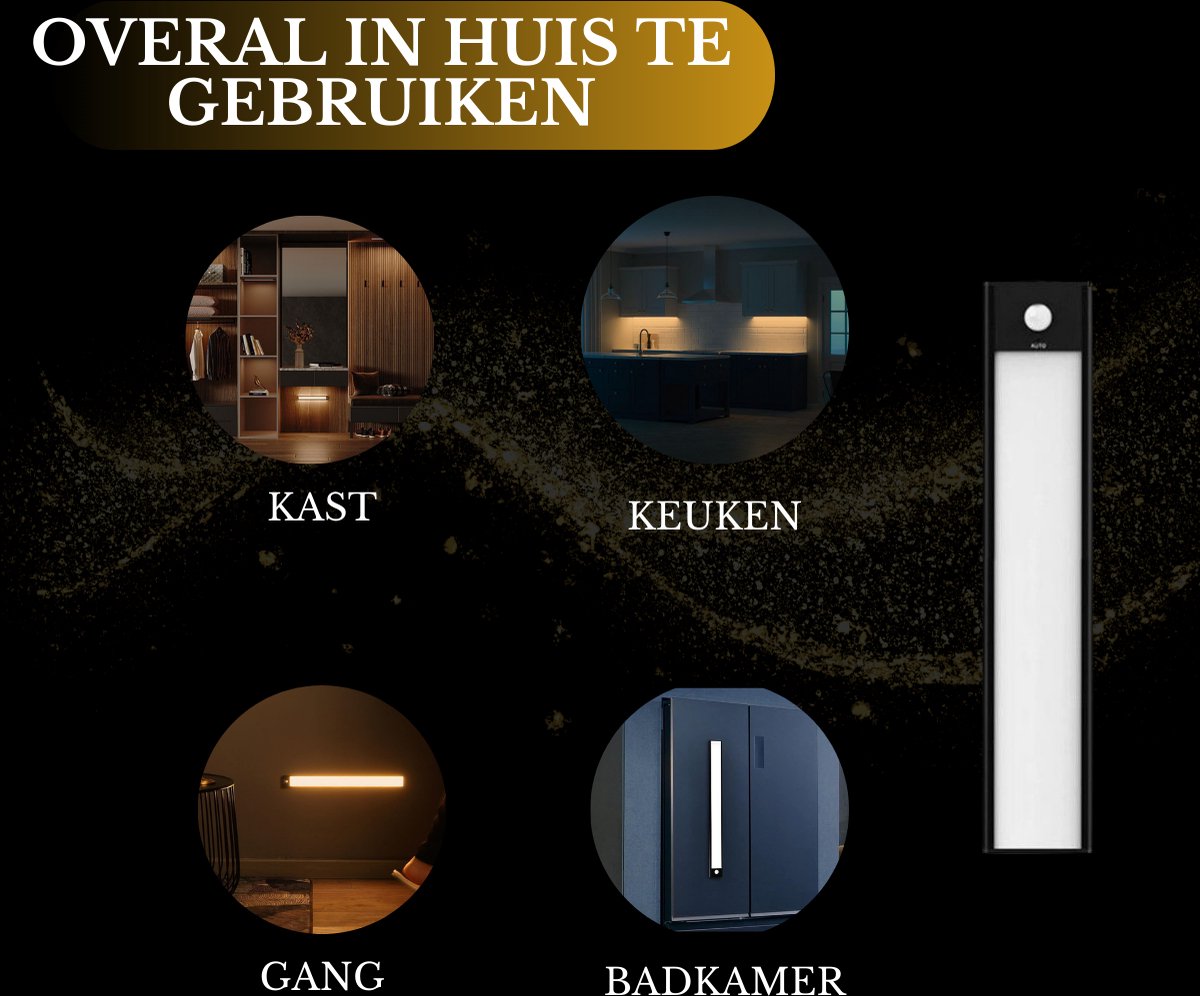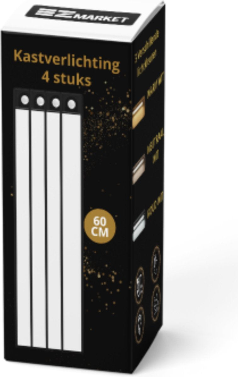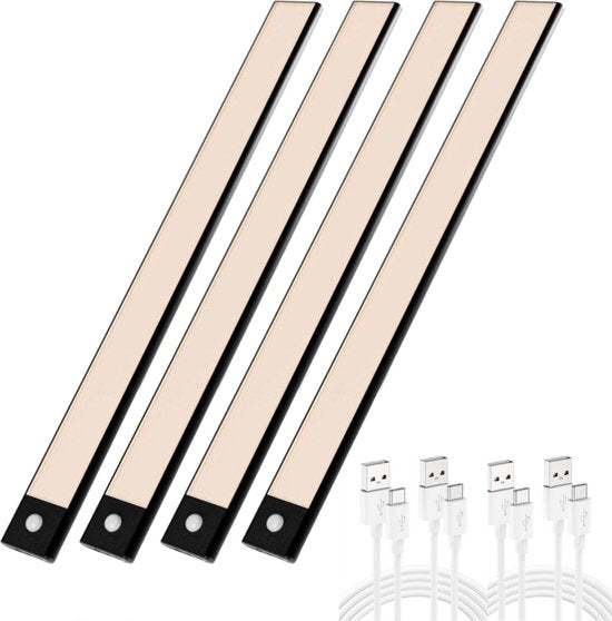 Hoogwaardige kwaliteit onderbouwverlichting (Nu in een 4-stuks voordeelpack), speciaal ontworpen voor gebruik in keukens, kasten en vitrines maar ook zeer handig als nachtlampje. In deze luxe onderbouwverlichting zijn 60 led lampjes verwerkt die optimaal licht geven. Deze veelzijdige verlichtingsoplossing van 60 centimeter lang dient ook als betrouwbare trap- en gangverlichting, waardoor het veiliger en sfeervoller wordt. Instelbare Helderheid en Design Met een indrukwekkende helderheid van 350 lumen biedt deze onderbouwverlichting voldoende licht om donkere ruimtes te verlichten. Bovendien is de helderheid volledig aanpasbaar, variërend van een zachte gloed tot helder daglicht, dankzij de dimbaarheid van 0% tot 100%. De onderbouwverlichting is vervaardigd uit hoogwaardig aluminium. Met een slank profiel van slechts 0,8 cm dik voegt het zich naadloos in uw interieur. Verlichting op Maat Kies uit drie verschillende lichtkleuren om de juiste sfeer te creëren voor elke gelegenheid. Met 2700K, 4000K en 6000K kunt u moeiteloos schakelen tussen warme, neutrale en koele verlichting door eenvoudigweg de aan/uit knop ingedrukt te houden. Drie Handige Modi Deze onderbouwverlichting heeft drie handige modi. In de eerste modus brandt de lamp constant, met een gebruiksduur van 6 uur. De tweede modus activeert de bewegingssensor, die bij detectie van beweging binnen 120 graden en 5 meter inschakelt en na 20 seconden zonder beweging weer uitschakelt met een gebruiksduur bij sporadisch gebruik van 30 dagen. De derde modus biedt een snelle uitschakeling. Oplaadbaar en Krachtig U hoeft zich geen zorgen te maken over batterijen, want onze lamp is uitgerust met een krachtige 1500 mAh accu. Met een constante brandtijd van 6 uur en een indrukwekkende standby-tijd van 30 dagen bij sporadisch gebruik, is de verlichting altijd klaar wanneer u deze nodig hebt. Eenvoudige Installatie Montage is een fluitje van een cent. Begin met het verwijderen van de stickers van de clips en bevestig deze stevig op een gladde ondergrond. Vervolgens kunt u de onderbouwverlichting moeiteloos op de clips plaatsen, dankzij het magnetische ontwerp. Geen gedoe met draden of gereedschap! Nederlandse Handleiding Inbegrepen Voor uw gemak wordt een gedetailleerde Nederlandse handleiding meegeleverd, zodat u de verlichting moeiteloos kunt installeren en aanpassen aan uw wensen. Specificaties:
