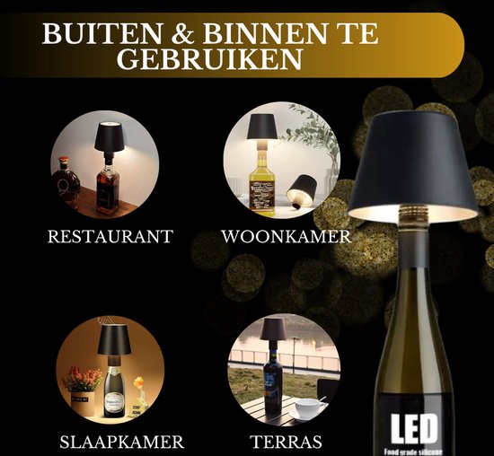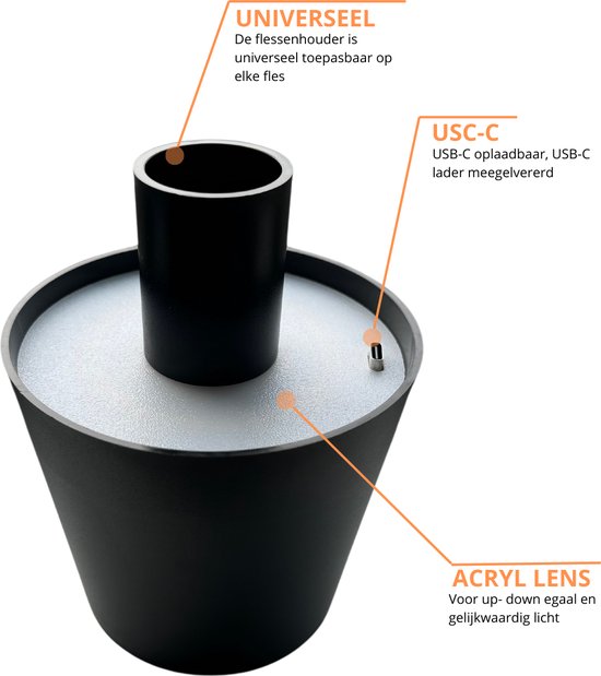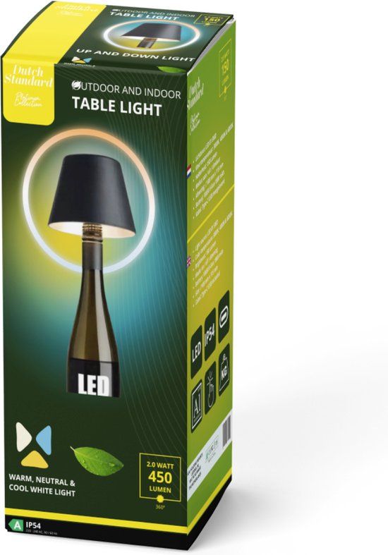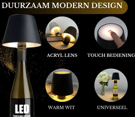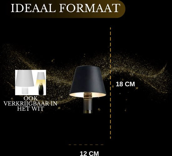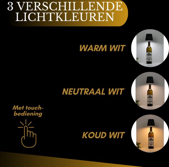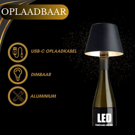 Deze oplaadbare flessenlamp is een stijlvolle en praktische keuze voor zowel binnen als buiten. Met zijn compacte afmetingen van 18 x 12 x 12 cm en strakke zwarte design past hij in elke omgeving. De lamp heeft een krachtige 1800 mAh accu die je kunt opladen met de meegeleverde USB-C kabel. Hij biedt drie verschillende lichtkleuren, is dimbaar en eenvoudig te bedienen via touch. Dankzij de waterdichte behuizing (IP54) kun je hem overal gebruiken. Afhankelijk van de lichtsterkte gaat hij 8 tot 40 uur mee, en binnen 4 tot 6 uur is hij weer volledig opgeladen. Krachtige Accu voor Langdurig Gebruik Voorzien van een extra grote 1800 mAh accu, biedt deze lamp je langdurige verlichting. Afhankelijk van de ingestelde lichtsterkte gaat de lamp tussen de 8 en 40 uur mee op een volle lading. De flessenlamp is binnen 4 tot 6 uur volledig opgeladen via de meegeleverde USB-C kabel. Een handig indicatielampje laat je weten wanneer de lamp wordt opgeladen (rood) en wanneer hij volledig is opgeladen (groen). Flexibele Verlichting met 3 Lichtkleuren Pas de sfeer aan naar jouw wens met de drie verschillende lichtkleuren die deze lamp biedt. Dankzij de touch-functie schakel je moeiteloos tussen warm wit, neutraal wit, en koud wit licht. Deze flexibiliteit maakt de lamp geschikt voor elke gelegenheid, of je nu een zacht, warm licht wilt voor een diner of helder licht voor het lezen. Dimbaar en Eenvoudig te Bedienen De flessenlamp is uitgerust met 48 LED's die een krachtige en heldere verlichting geven. Dankzij de dimbare functie kun je eenvoudig de lichtsterkte aanpassen om de perfecte ambiance te creëren. Bedien de lamp met een simpele aanraking; de touch-functie maakt het instellen van zowel de kleur als de helderheid eenvoudig en intuïtief. Waterdicht en Weerbestendig Met een IP54-classificatie is deze flessenlamp waterdicht en bestand tegen stof en spatwater. Hierdoor is hij niet alleen geschikt voor binnen, maar ook perfect voor buitengebruik. Of het nu regent of de zon schijnt, deze lamp blijft betrouwbaar presteren. Het slanke en robuuste ontwerp maakt het een ideale keuze voor elke omgeving, van je woonkamer tot je terras. Specificaties van de Flessenlamp: